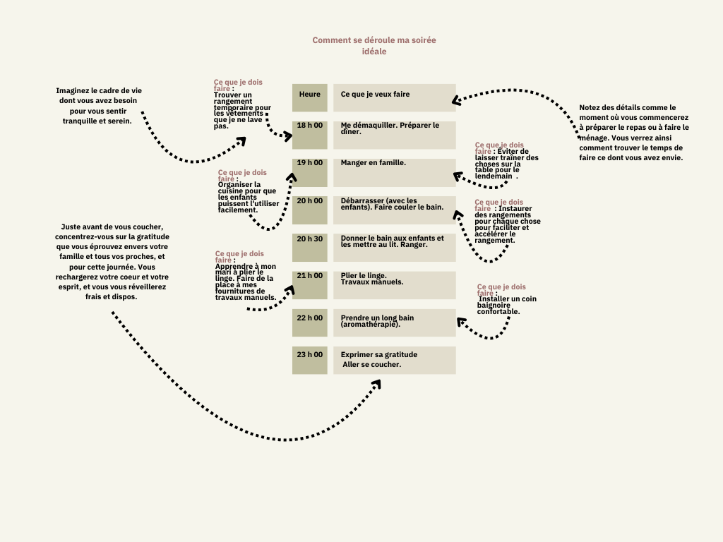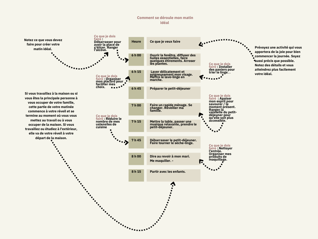 Ensuite, passez à votre journée idéale. Décrivez chaque étape, de votre trajet quotidien jusqu’à votre retour à la maison. Comment utilisez-vous votre temps ? Quelles activités vous procurent le plus de joie ? Et surtout, comment pouvez-vous intégrer ces moments de bonheur dans votre quotidien grâce au rangement ?